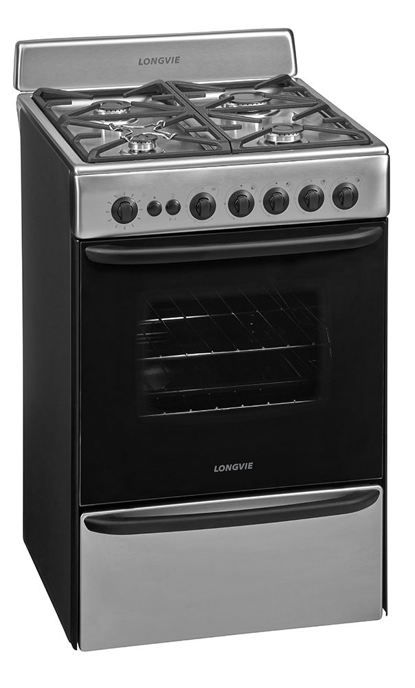 Acero inoxidable con rejas de hierro fundido, timer, luz y encendido electrónico.