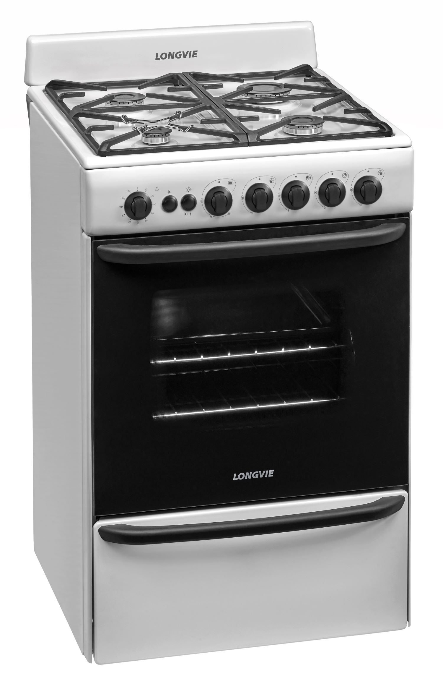 Blanca con rejas de hierro fundido y encendido electrónico.
