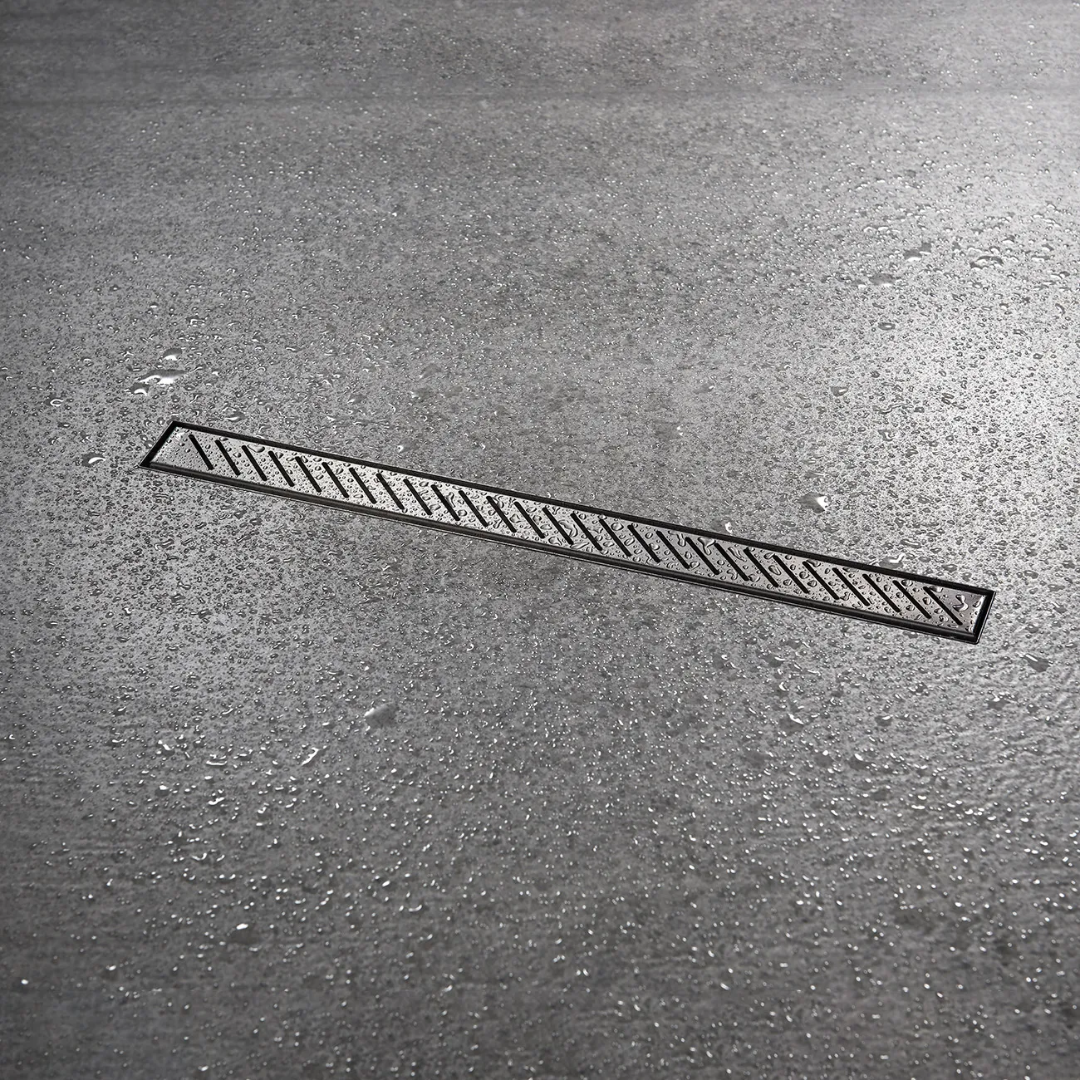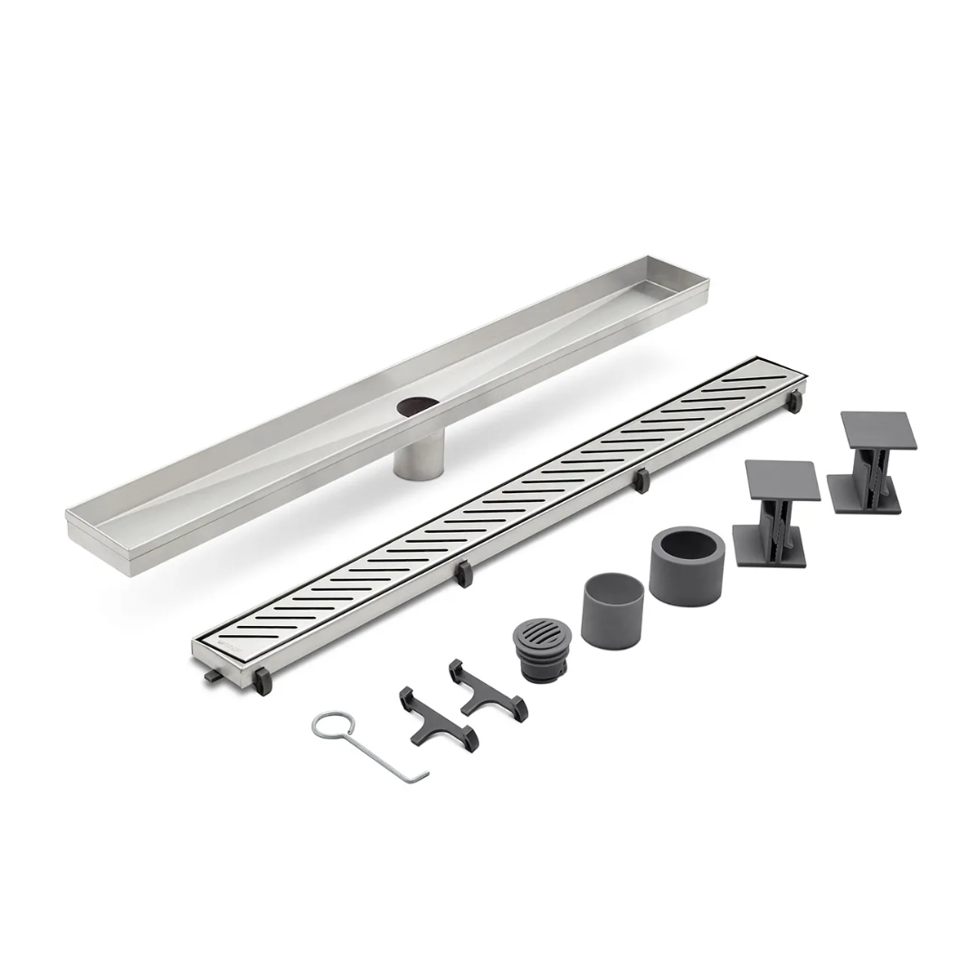 Desagüe de acero inoxidable AISI 304 doble esmerilado, tapa de patrones de líneas en diagonal. Diseñado para reemplazar la rejilla tradicional. Con caída en forma de diamante permite una mayor capacidad de drenaje.